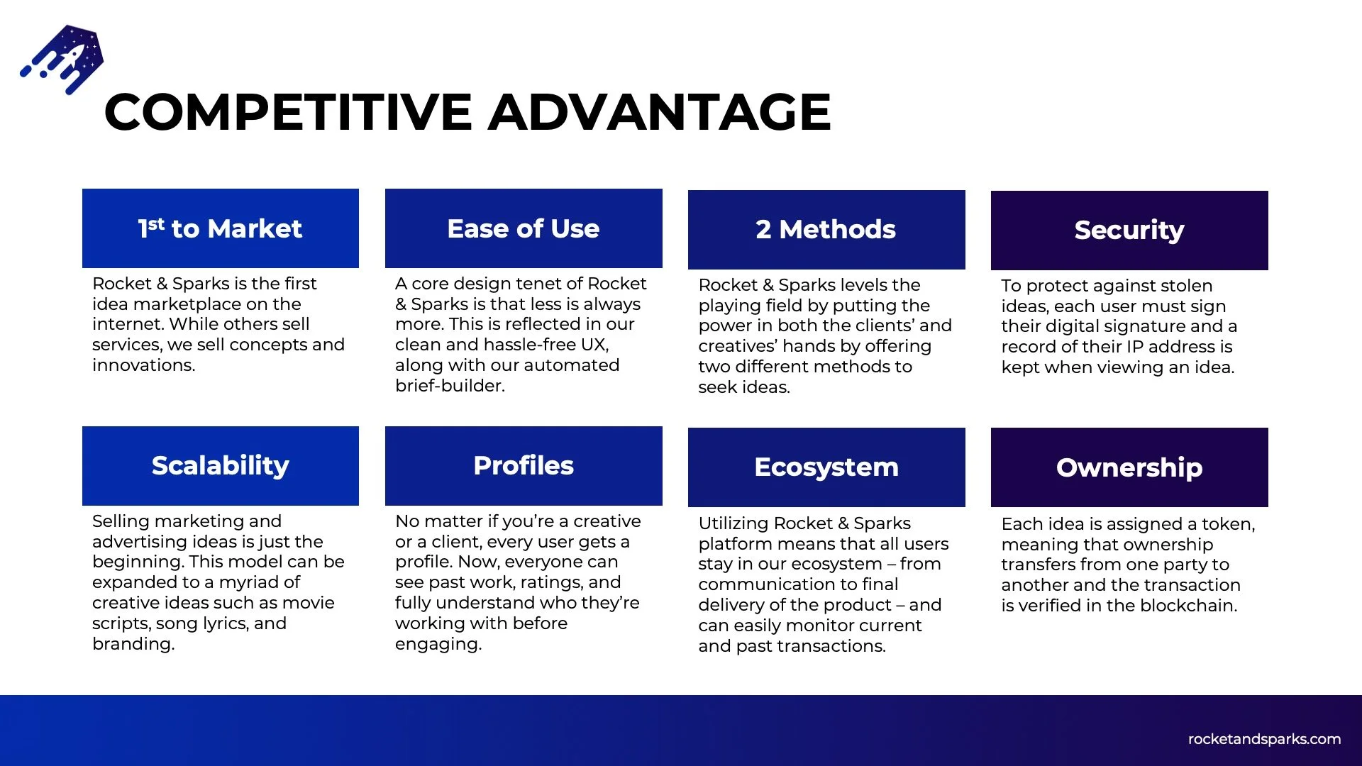 Slide 1 Slide 1 (current slide) Slide 2 Slide 2 (current slide) Slide 3 Slide 3 (current slide) Slide 4 Slide 4 (current slide) Slide 5 Slide 5 (current slide) Slide 6 Slide 6 (current slide) Slide 7 Slide 7 (current slide) Slide 8 Slide 8 (current slide) Slide 9 Slide 9 (current slide) Slide 10 Slide 10 (current slide) A PDF version of the Rocket & Sparks Investor Deck can be downloaded here.